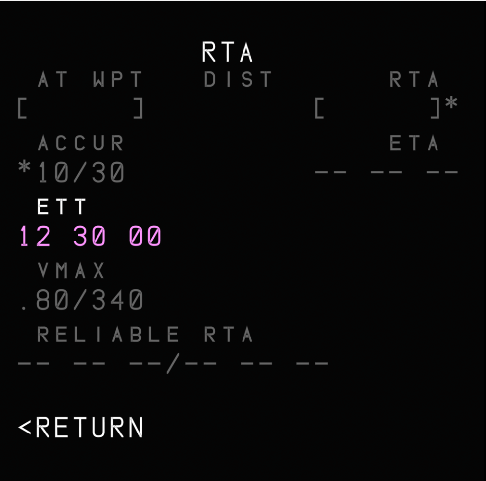 On this page, we can find the ETT prompt at LSK 3L, where we can add our ETT. The ETT can be inserted in HMM, HHMM, HHMMS, or HHMMSS format. Any entry that does not follow these rules will result in a "FORMAT ERROR". Here, we will insert 1230 and, upon doing so, the ETT is accepted and shown in magenta.