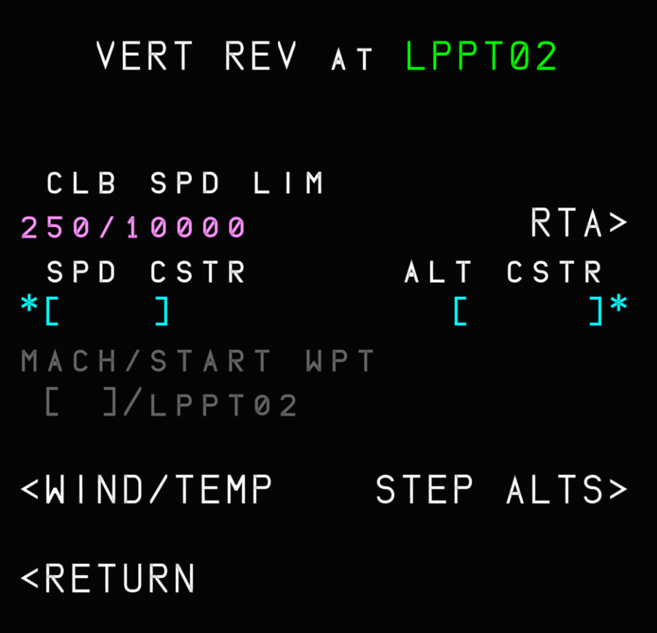 In order to enter an ETT, we must first perform a vertical revision on any waypoint of choice by pressing one of the right-side LSKs on the MCDU.