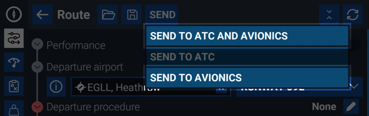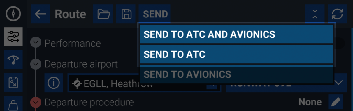 3. Select "SEND TO AVIONICS AND ATC" or "SEND TO ATC" depending on whether you want to also load the route into the aircraft's FMS as well.