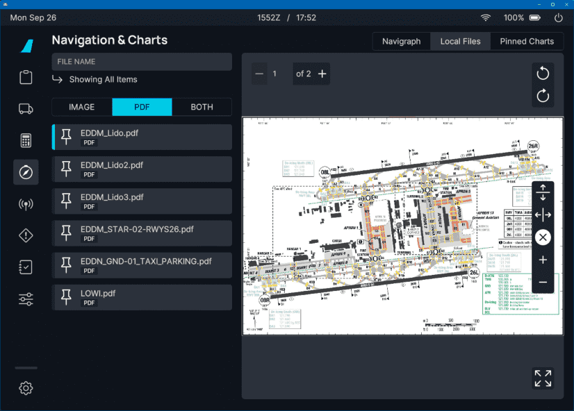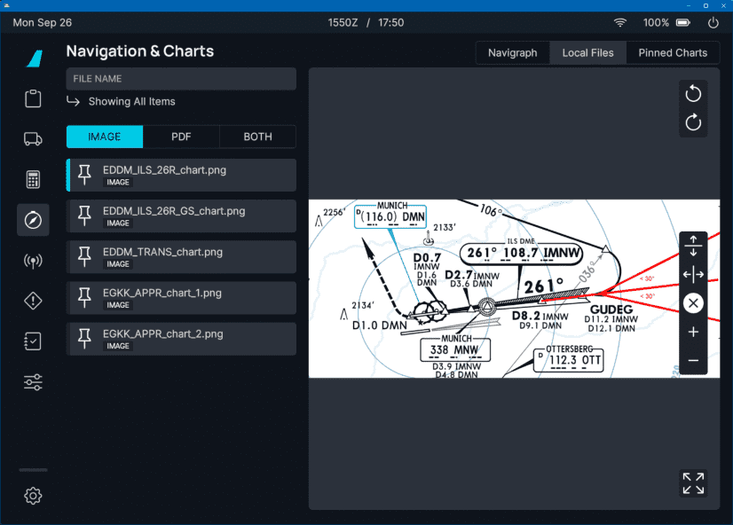 Local files (images, PDF) stored in a specific folder (see below) on the PC will be listed and can be opened similar to the Navigraph charts.