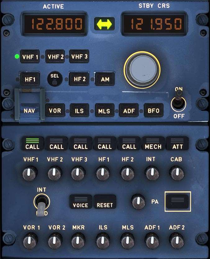 - STBY/CRS (standby/course) display: Standby frequency, which can be changed by the frequency change knobs and transferred to the active window by pressing the Transfer Key.
