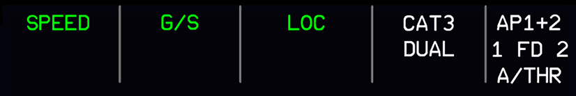 The Flight Mode Annunciator (FMA) at the top of the PFD, shows the status of the A/THR, the AP/FD vertical and lateral modes, the approach capabilities, and the AP/FD-A/THR engagement status. It is divided into five columns, which are described in this section.