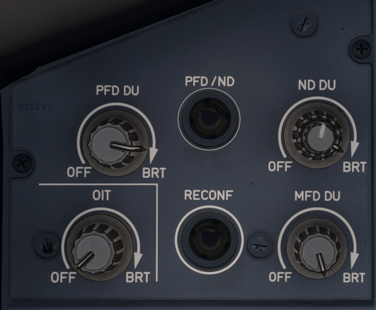 The Display Unit Control Panel (DU CP) is located on the main instrument panel on each side for the Captain and the First Officer. The DU CP is used to configure the displays for the Primary Flight Display (PFD), the Navigation Display (ND), the Onboard Information Terminal (OIT), and the Multi-Function Display (MFD).