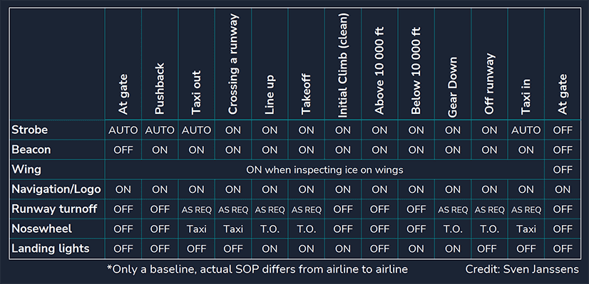 - Turns on both taxi and takeoff lights.